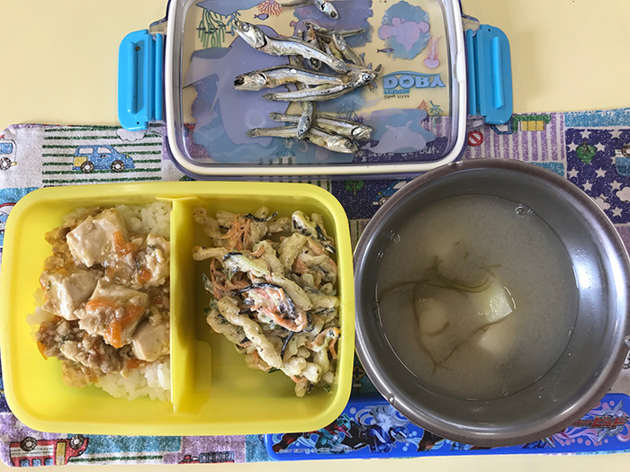 ひじきご飯、味噌汁、スペイン風オムレツ、大根の煮物、チーズ